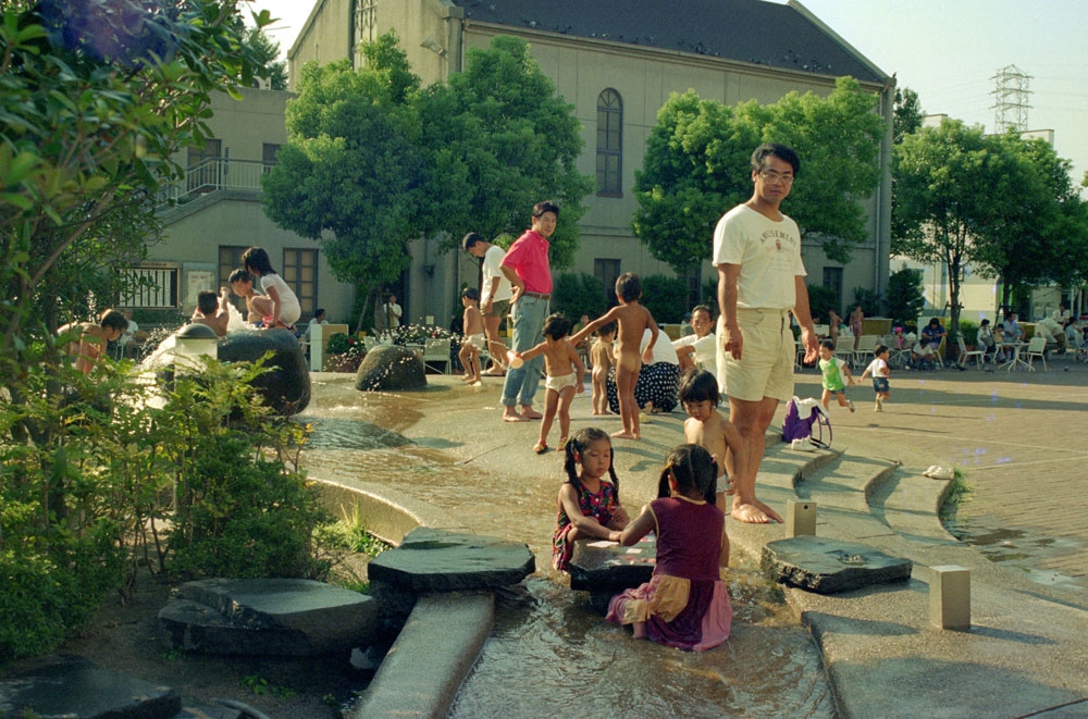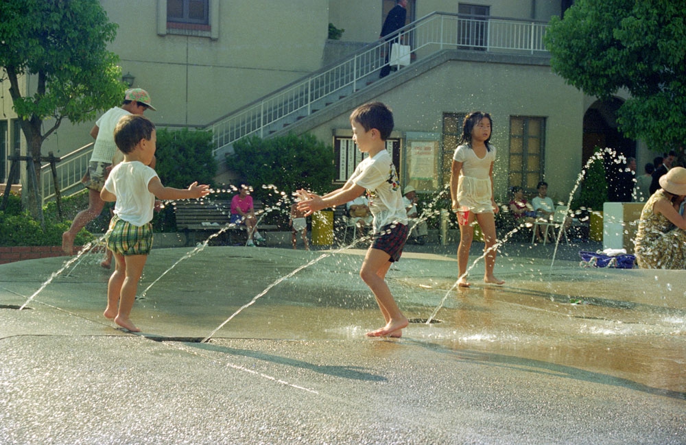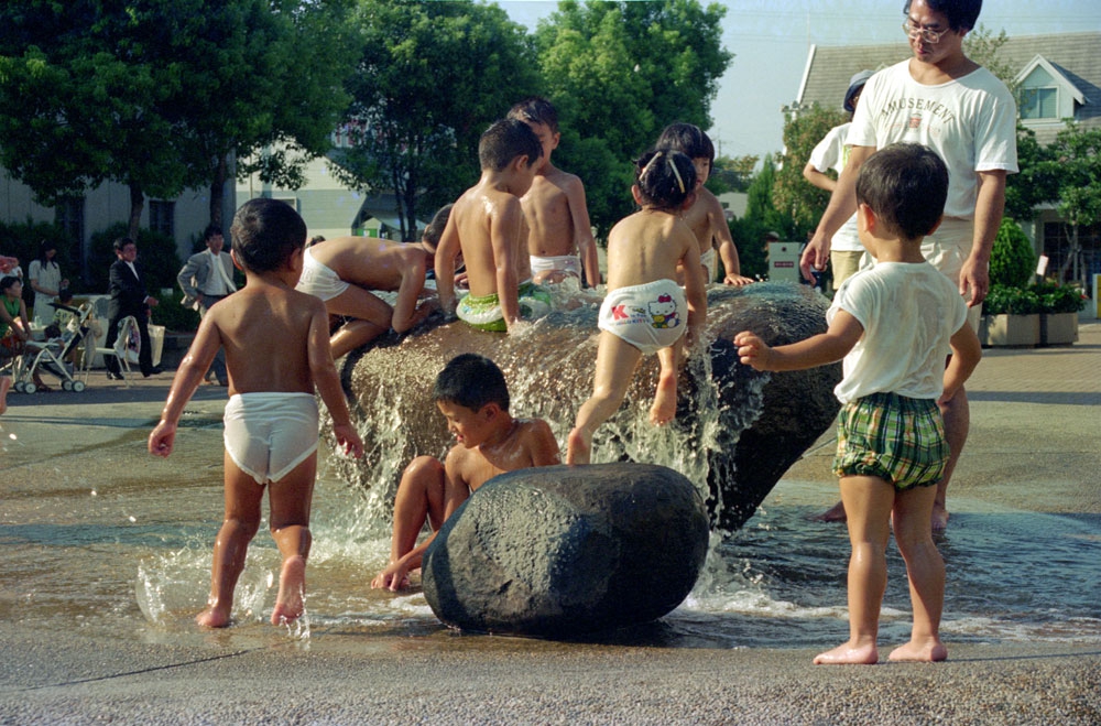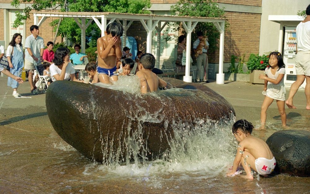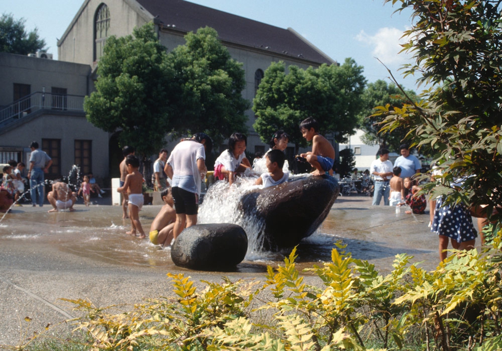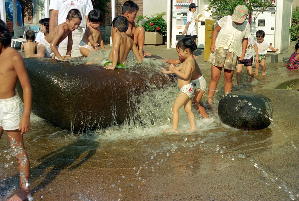 わたしはアクアビットの丘と名付けたのも、都会に住む子供たちが安全に生き生きと水と戯れ、わくわくさせる装置としての環境芸術空間を創りたかった。よちよち歩きの幼子から小学生のこどもたちまでパンツひとつになって、歓声をあげる。こどもたちを見守る親たちは洋服の着替え持参でこのひろばにやってくるようになった。ショッピングモールにつくられたこの広場は評判となり、ショッピングや劇場鑑賞の間、代表の大人がこどもたちを見守る。ある種の一時預かり保育施設のようでもあった。当時、ビジネス業界では芸術の経済効果とまでいわれる評判となった作品だ。