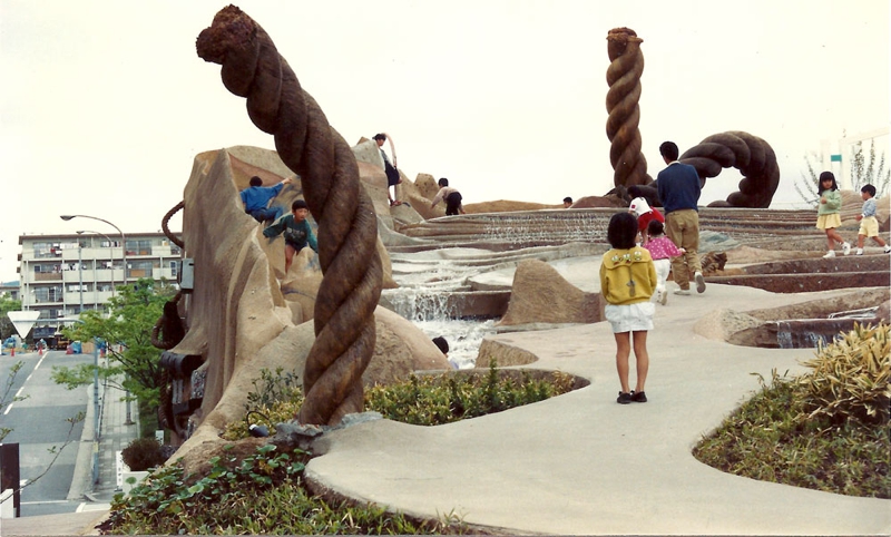 During the 1980s and 1990s I moved beyond singular sculptural pieces to create extensive “artscapes.” These were narrative, poetic, educational and expressive landscapes incorporating elements of gardens, plazas, playgrounds and parks, including fountains, waterfalls, green space, light systems, sound systems and sculptural work. These site-specific public art projects serve to transform communities and inspire new hope. In order to make the required large construction works, I obtained a civil engineering license in Japan and established a new construction company, “International Public Art Company, Ltd.” Since I was dissatisfied with existing technologies and construction mechanisms, I invented new technologies in order to complete the “artscapes” installations within budgetary limits. This work has generated new patents and has also, I am pleased to report, helped inspire the resurgence of traditional craftsmanship in Japanese architecture and construction.