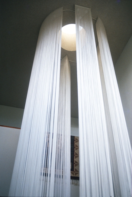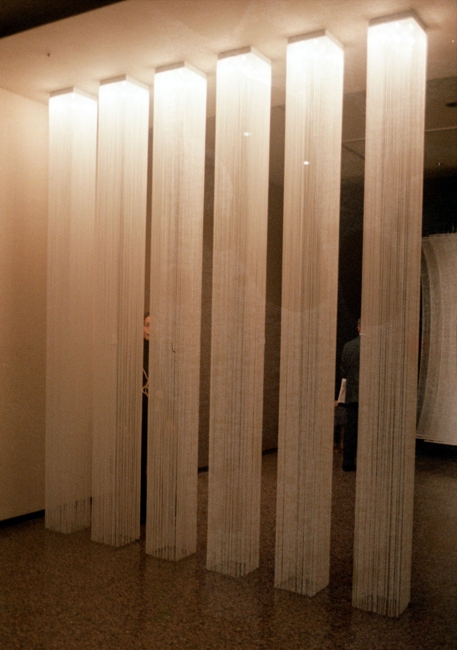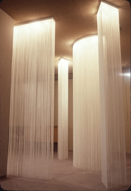 坂茂はエミリオ•アンバーツ展の設計において、 自在に空間間仕切りできる「光る糸カーテン GARBO照明」を多用するデザインをしている。