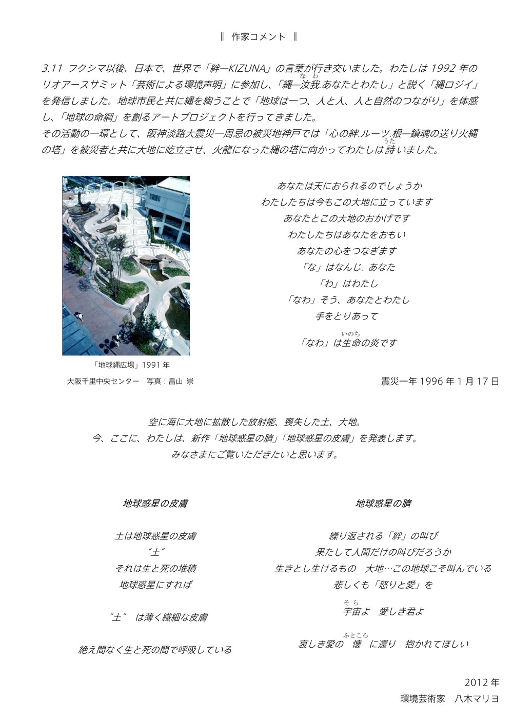 その芸術が地球や宇宙的生命環境を深く考える契機となることを切実に想っている。