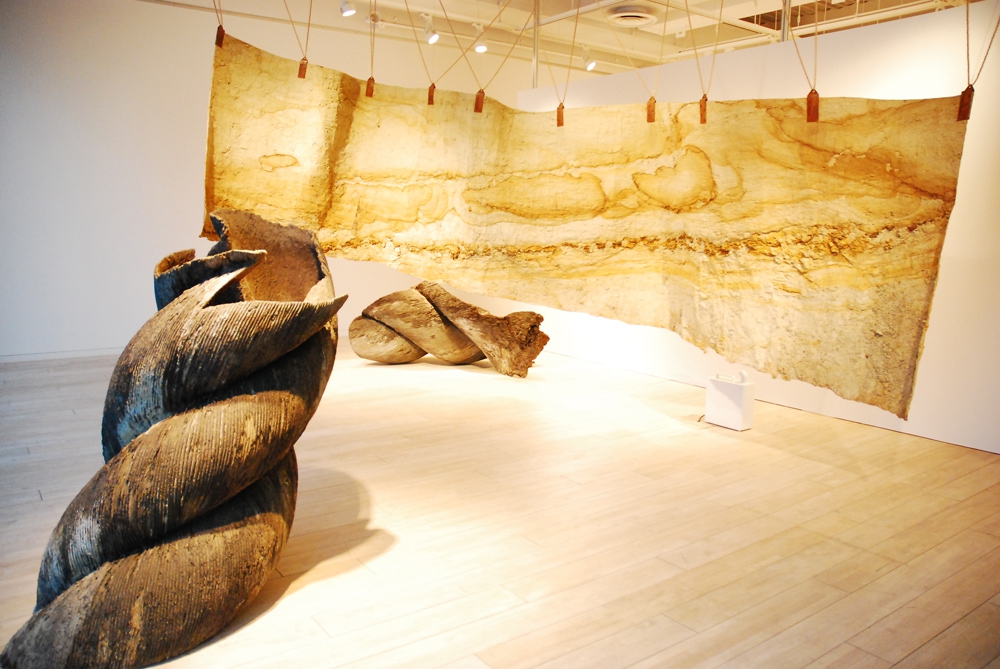京都宇治の山の切り土を剥ぎ取った地層そのものを天井から麻縄で吊ったインスタレーション作品。